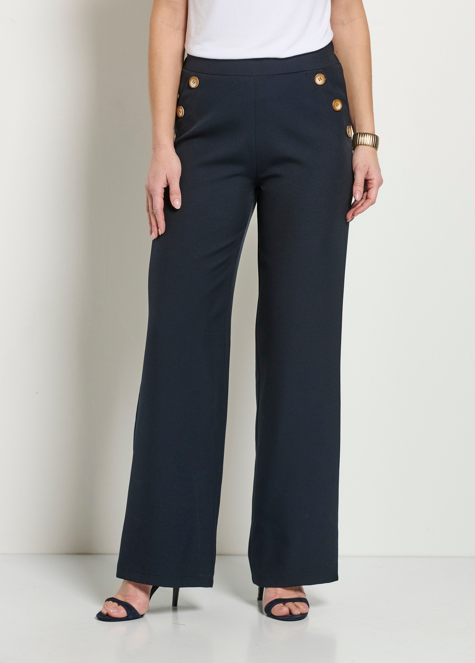 Met zijn comfortabele stretchstof en vloeiende, wijde pijpen ziet deze damesbroek er de hele dag geweldig uit! Voor extra gemak is de platte tailleband aan de voorkant elastisch aan de achterkant. Voor extra stijl zijn de faux Italiaanse zakken versierd met 3 mooie knopen. Gemaakt in Frankrijk.