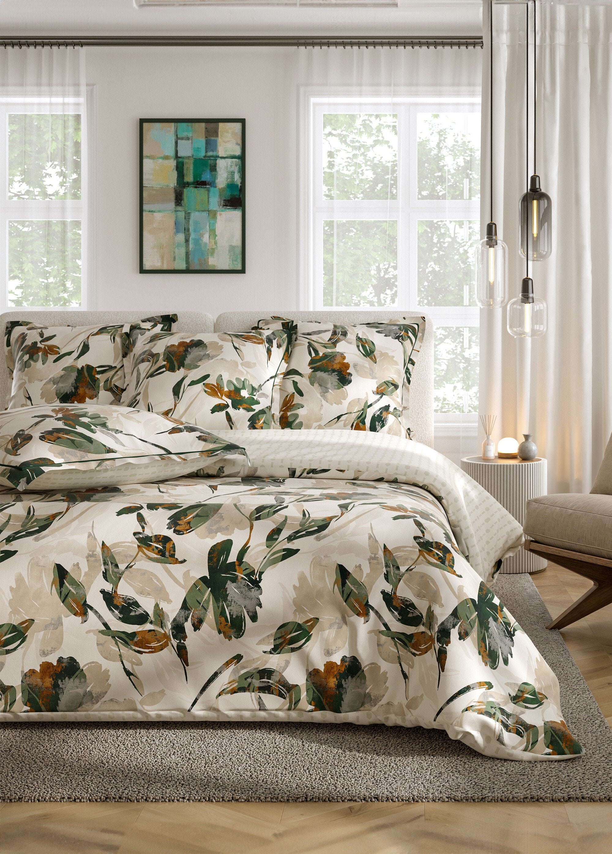 Ontdek onze 3-delige beddengoedset in perkal, die comfort en elegantie combineert. Deze collectie bestaat uit een dekbedovertrek en twee kussenslopen, allemaal versierd met een boeiend aquarelpatroon. De perkalstof staat bekend om zijn zachtheid en ademend vermogen, waardoor je verzekerd bent van een rustige nachtrust. Maak van je slaapkamer een oase van rust met deze set die een artistiek tintje aan je inrichting geeft. Trakteer jezelf op de luxe van een goede nachtrust in een stijlvolle en verfijnde omgeving.
