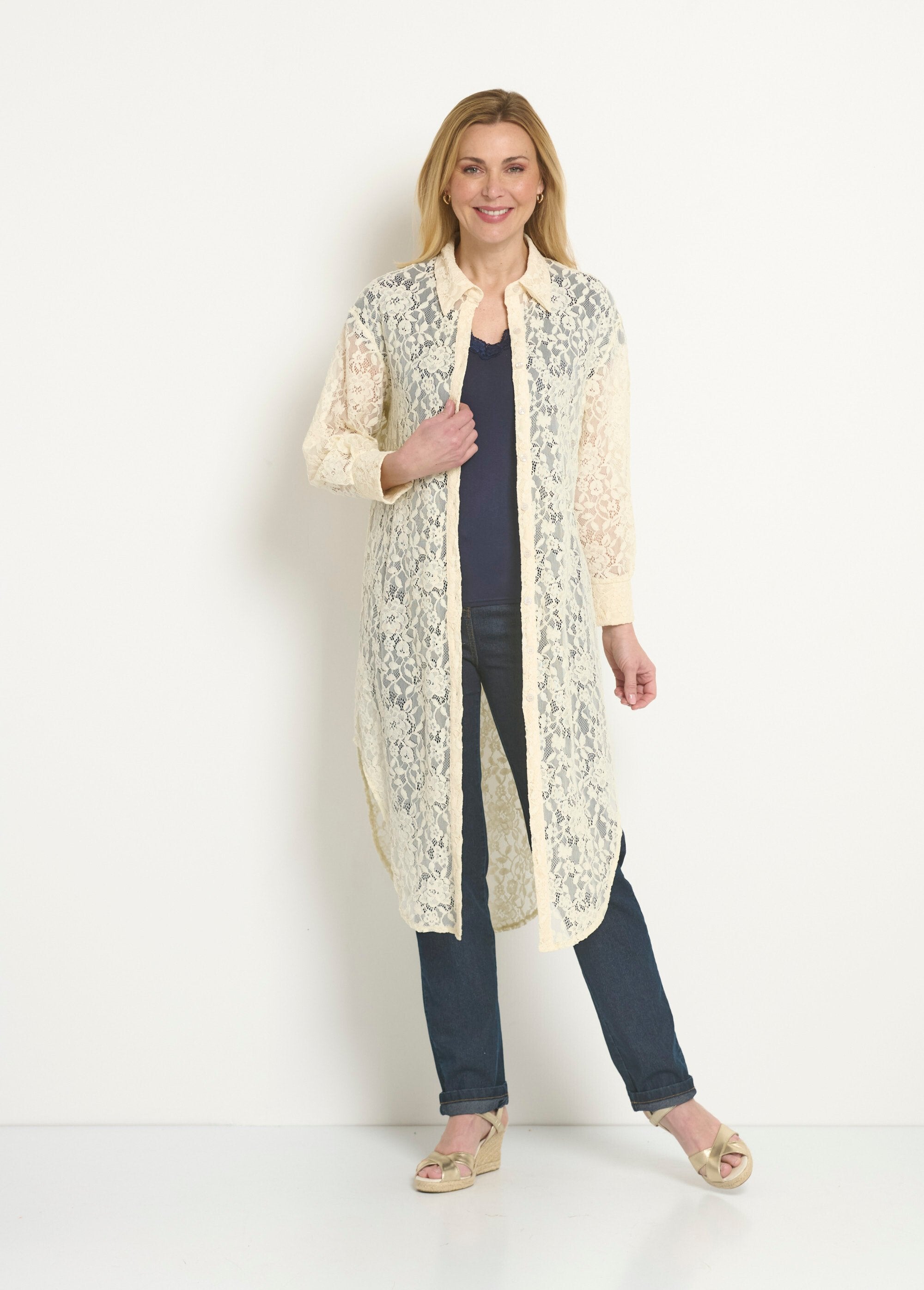 Deze lange blousejurk, volledig gemaakt van delicaat kant, verleidt met zijn elegante soepelheid en verfijnde details. De jurk heeft een knoopsluiting aan de voorkant en een tijdloze charme die het silhouet subtiel accentueert. De lange mouwen voegen een vleugje verfijning toe, terwijl de luchtigheid van het kant zorgt voor een luchtige vloeiendheid, ideaal voor een outfit die zowel romantisch als modern is.