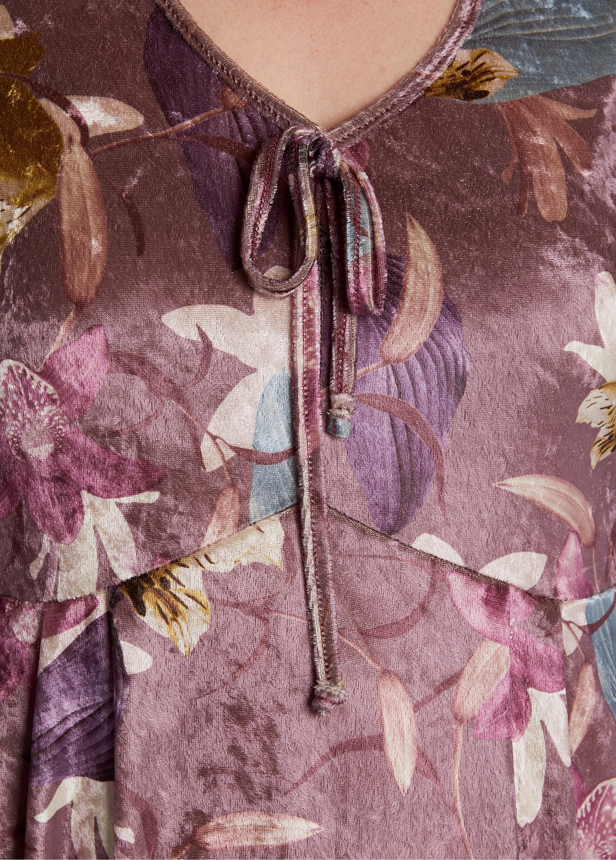 De hostess jurk is een charmante, comfortabele jurk die het figuur omhult met de warmte van het fluweel en de vrouwelijkheid van de print. Sierlijke strik bij de V-hals. Rimpels onder het borststuk voor extra volheid. V-halslijn. Hommelafwerking onderaan de mouwen, elleboog en zoom.