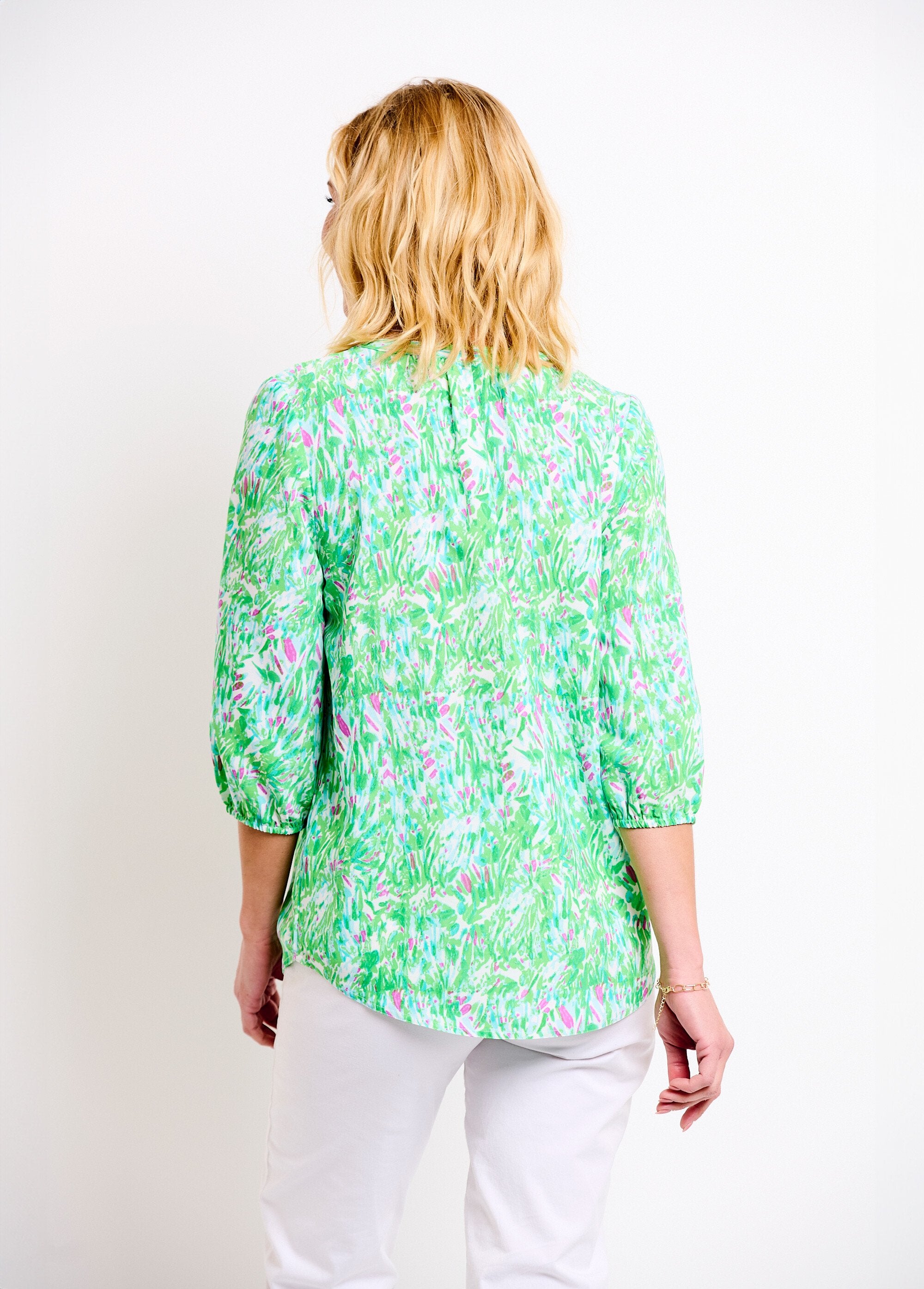 De ruime, zachte en gemakkelijk te dragen tuniek heeft een zacht aanvoelende stof, een trendy print en veel volume. De ronde, open V-hals aan de voorkant wordt benadrukt door een knoopsluiting met 3 knopen. Rimpels onder de voor- en achterkant van de hals zorgen voor extra gemak en volume. 3/4 mouwen, elastische manchetten. Licht afgeronde zoom.